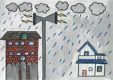 ② 雨音は、 窓から外を見ると、川がいまにもあふれそうだ。 〈タララララン!〉 と携帯の緊急メールが鳴り出した。 怖くなってきて、お母さんに 突然、お兄ちゃんが 「玄関まで水がきそうだ!!!」 私は、 外の道路は、まるで川のようになっていた。 私は、 それを見たお父さんが |