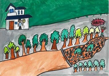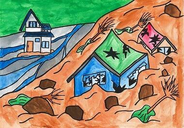 ⑥ 川が土でうまっている。 「うわあ!川の水が道路に、どばどば、流れてる!家の周りが川みたい」 「まだ、水が家の中に入ってくる」 「すごい、土砂がいっぱいだ」 「なんか変なにおいがする。何のにおいだろう」 「あーっ!向こうの家が崩れてる」 「友達はだいじょうぶかなあ」 みんな不安でいっぱいだった。 「これからどうなるんだろう…」 |