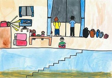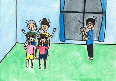 ④ 「うわー、何の音?」 急に電気が消えて真っ暗になった。 「いやだー!」 「うわー!」 みんなで不安になっていると、お父さんがあわてた様子で帰ってきた。 「た!大変だ!砂防ダムが崩れたらしい! 今、外に出るのは危険だから、二階に避難するぞ」 「お父さん、二階で大丈夫なの?」 「大丈夫だよ」 みんなは、急いでテレビなどを二階に運んで、自分たちも二階に上がった。 |