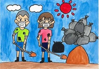 ⑦ 家のゆかを全部はがして、土や水をかきだした。 でも、かいても、かいても土がなくならない。 十分もしないうちに土のうぶくろが、ぱんぱんになる。 しかも、季節は夏だから暑い。 少し作業すると汗がぽたぽた、たれてくる。 暑いけど、マスクをしていないと、くさくて作業ができない。 「暑くてもう、やだ!」 「いつになったら、終わるの?」 「あと少しがんばろう!」 「もう少しやったら、休憩しましょうね」 お兄ちゃんは、黙々と作業を続けていた。その時、 |